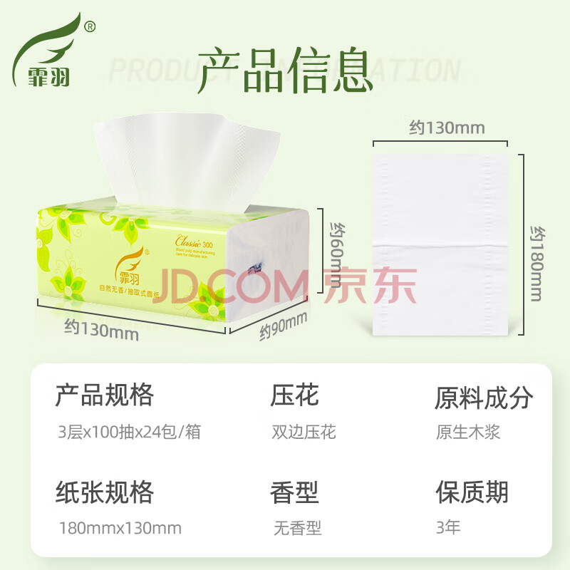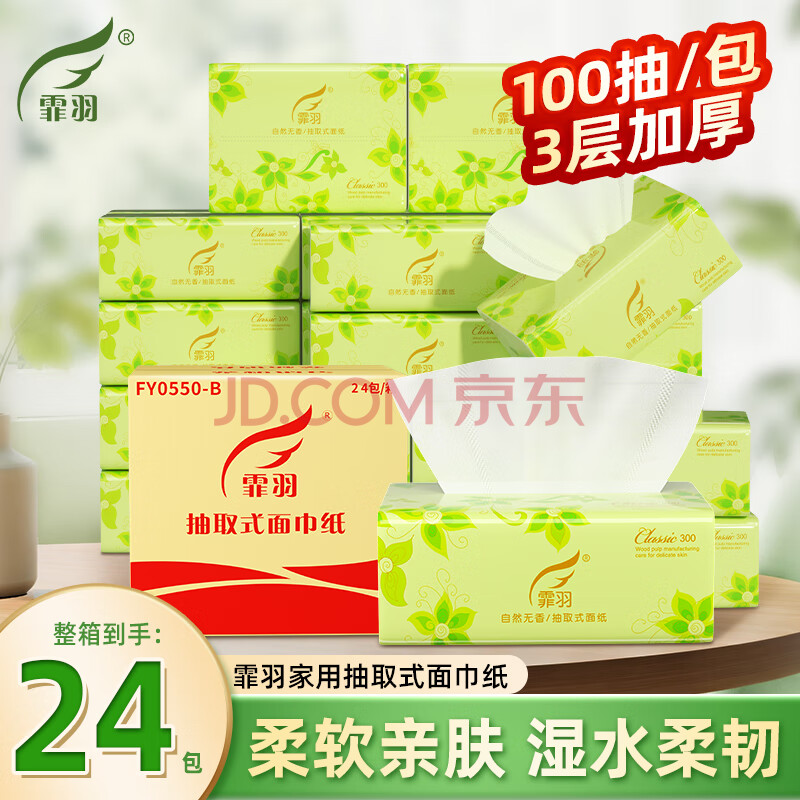 商品相册:霏羽抽纸3层100抽*24包家用抽取式餐巾纸家庭装面巾纸实惠装清洁用纸第