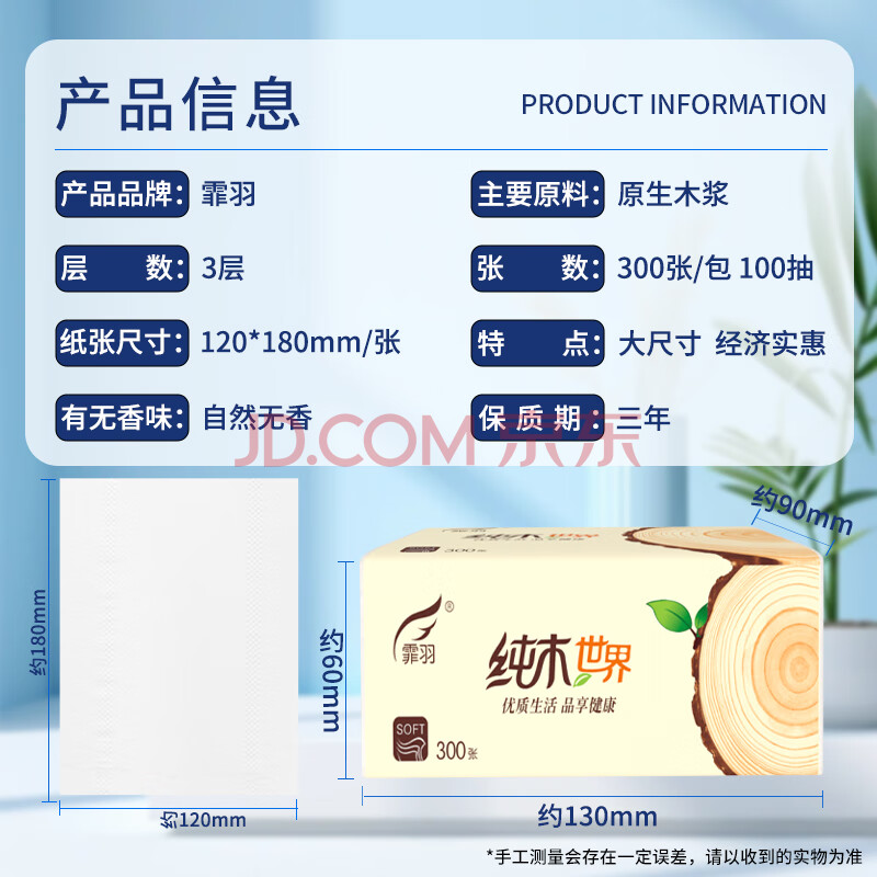 商品相册:霏羽抽纸3层100抽*24包家用抽取式柔厚餐巾纸原木浆面巾纸实惠装整箱第