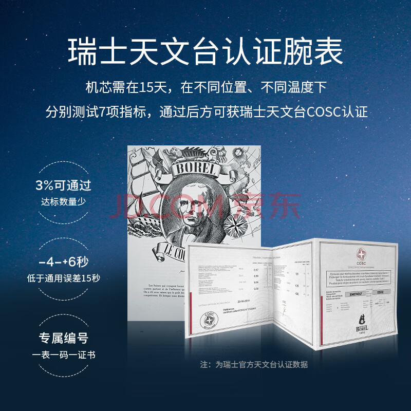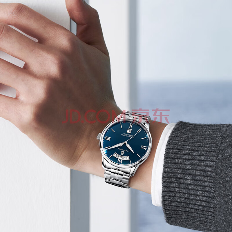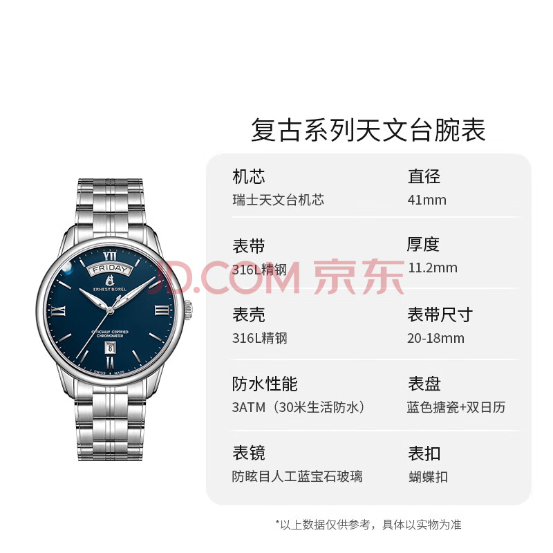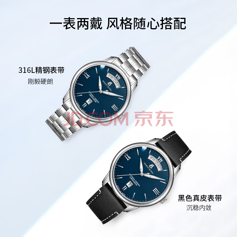 商品相册:依波路(ERNEST BOREL)瑞士手表男 新春礼物 天文台认证机械男表双日历夜光钢带蓝盘男表第