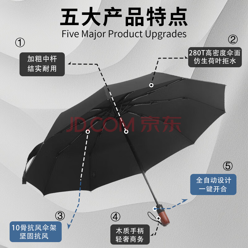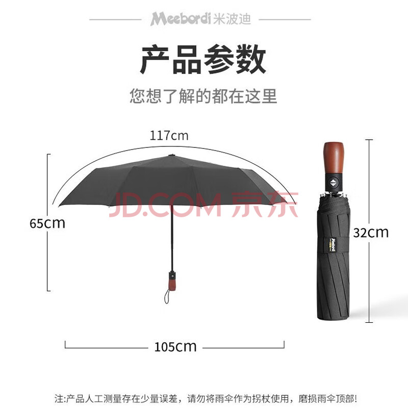 商品相册:米波迪(Meebordi)全自动雨伞三折 加固男士商务折叠伞木柄10骨105cm黑伞可定制第