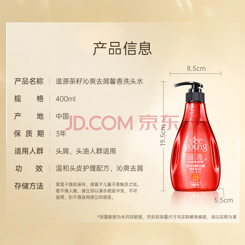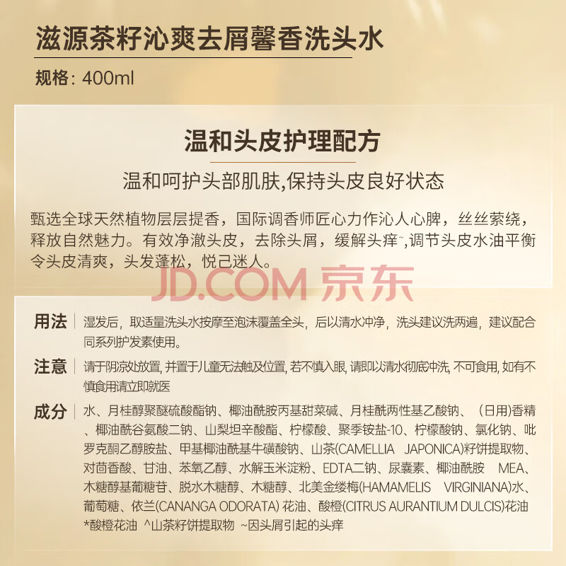 商品相册:滋源茶籽沁爽去屑馨香洗头水 无硅油香氛洗发水男女士控油清爽400ml第