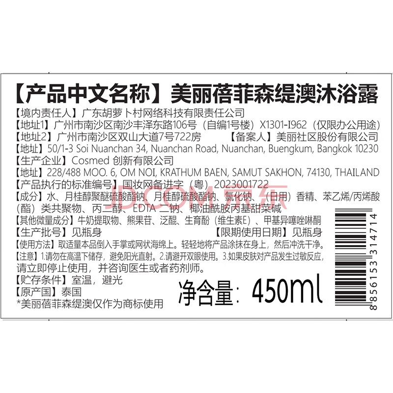 商品相册:美丽蓓菲森缇澳牛奶沐浴露乳450ml*1瓶滋润奶香牛奶润肤泰国进口学生礼品第