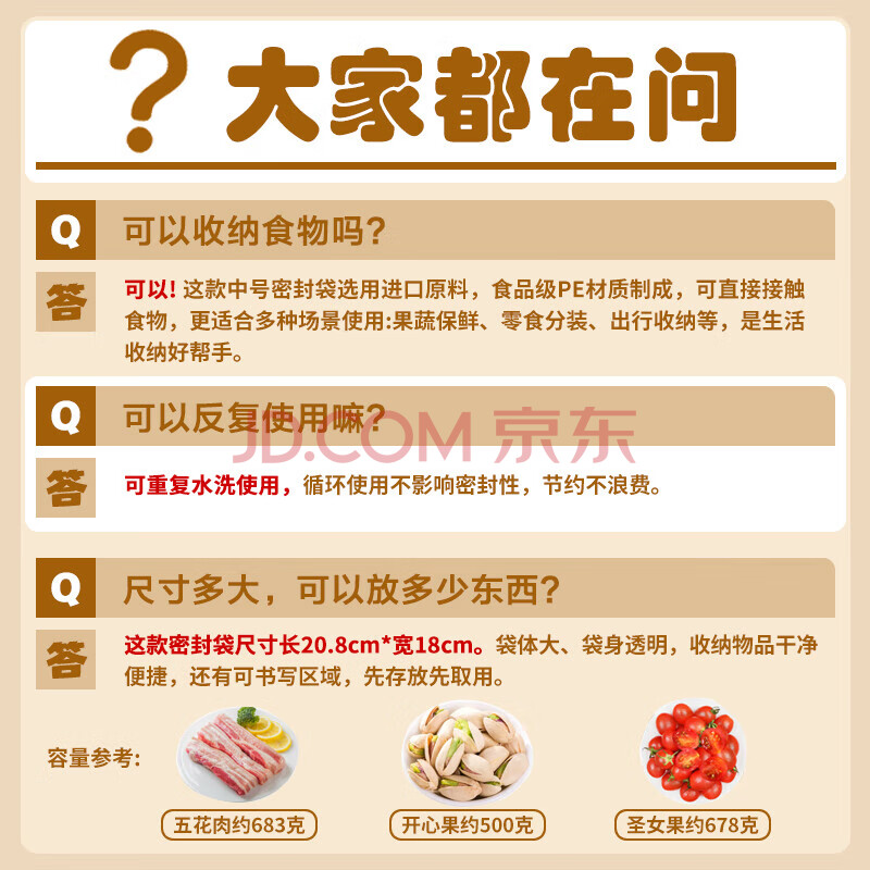 商品相册:京东京造 密封袋食品级保鲜袋烧烤露营中号双拉链密实袋18*20.8cm【50只】第