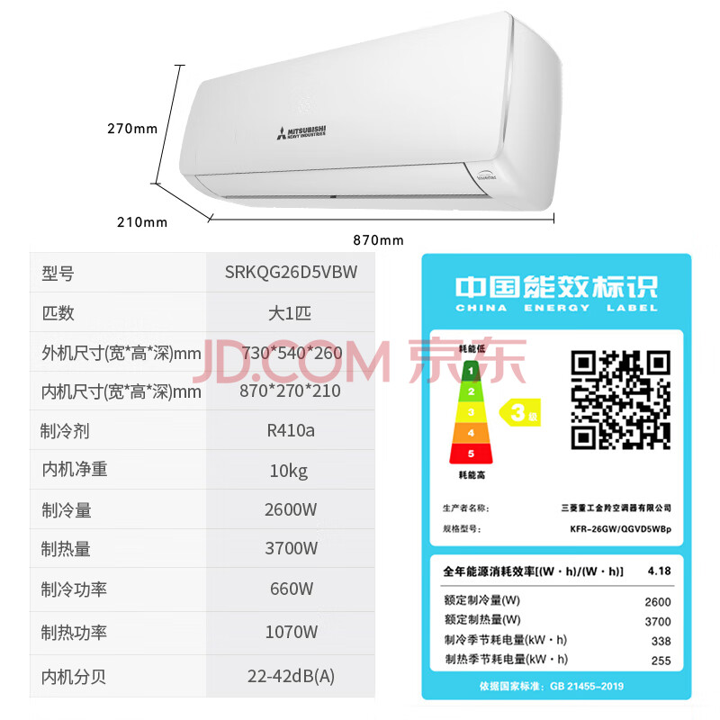 商品相册:三菱(MITSUBISHI)空调 1匹三级能效变频冷暖电辅热智能水洗大风量三菱重工空调挂机纯铜管SRKQG26第