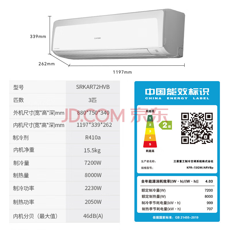商品相册:三菱(MITSUBISHI)空调 3匹二级能效整机原装进口冷暖三菱重工空调挂机大风量节能静音纯铜管KFR-72GW/ARVBp第