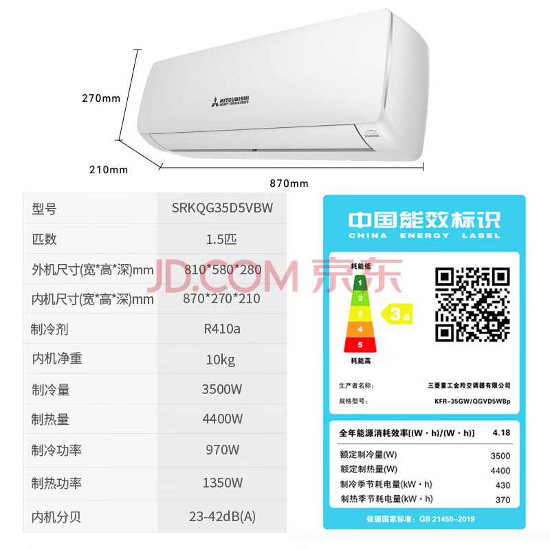商品相册:三菱(MITSUBISHI)空调 1.5匹三级能效变频冷暖电辅热大风量三菱重工空调挂机静音纯铜管SRKQG35D5VBW第