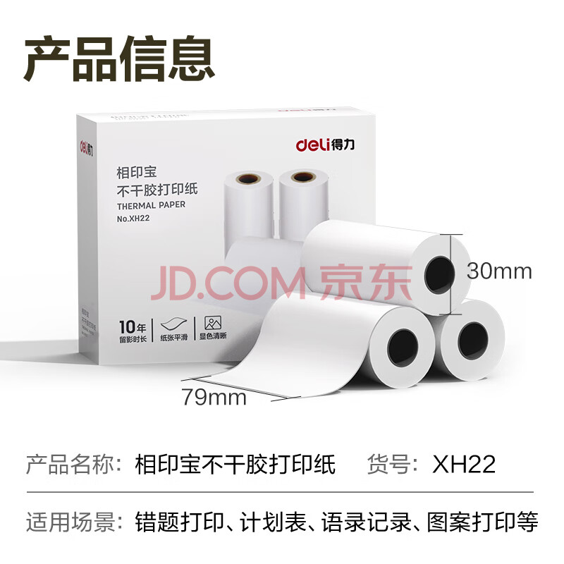 商品相册:得力(deli)3寸错题打印纸 79*30mm 3.5米*3卷 不干胶 喵喵机打印纸P3L/P3机型 得力X5S机型等适用 热敏纸XH22第