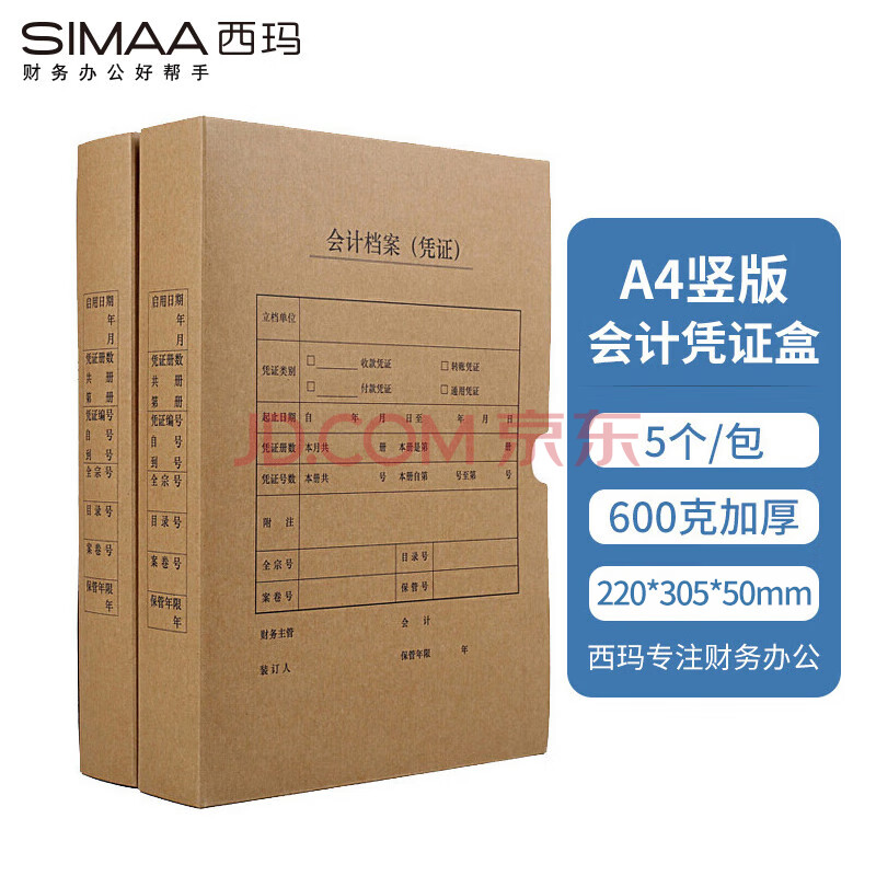 商品相册:西玛(SIMAA)A4会计凭证盒 单封口600g牛卡纸 220*305*50mm 5个/包 a4会计凭证档案装订盒HZ351第