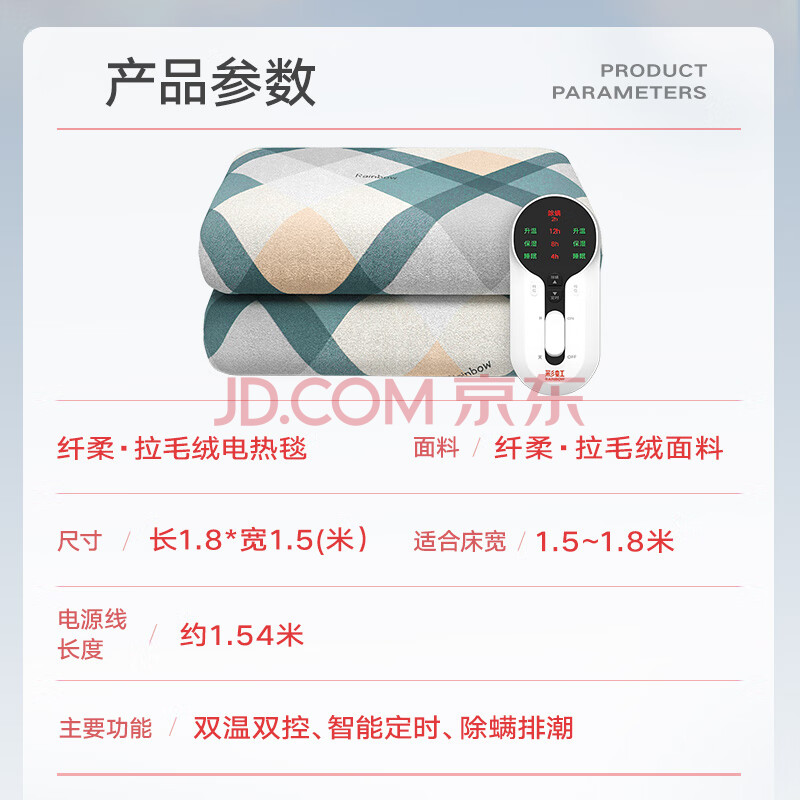 商品相册:彩虹【高温断电】双人定时双温双控除螨拉毛绒电热毯电褥子1.8*1.5米第1张/共3