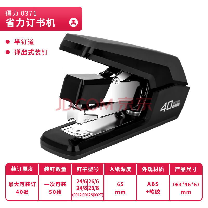 商品相册:得力(deli)省力订书机订书器中号办公用品学生专用文具办公室桌面必备适配24/6订书钉 黑色0371第