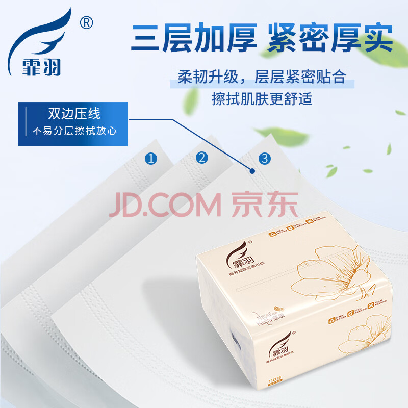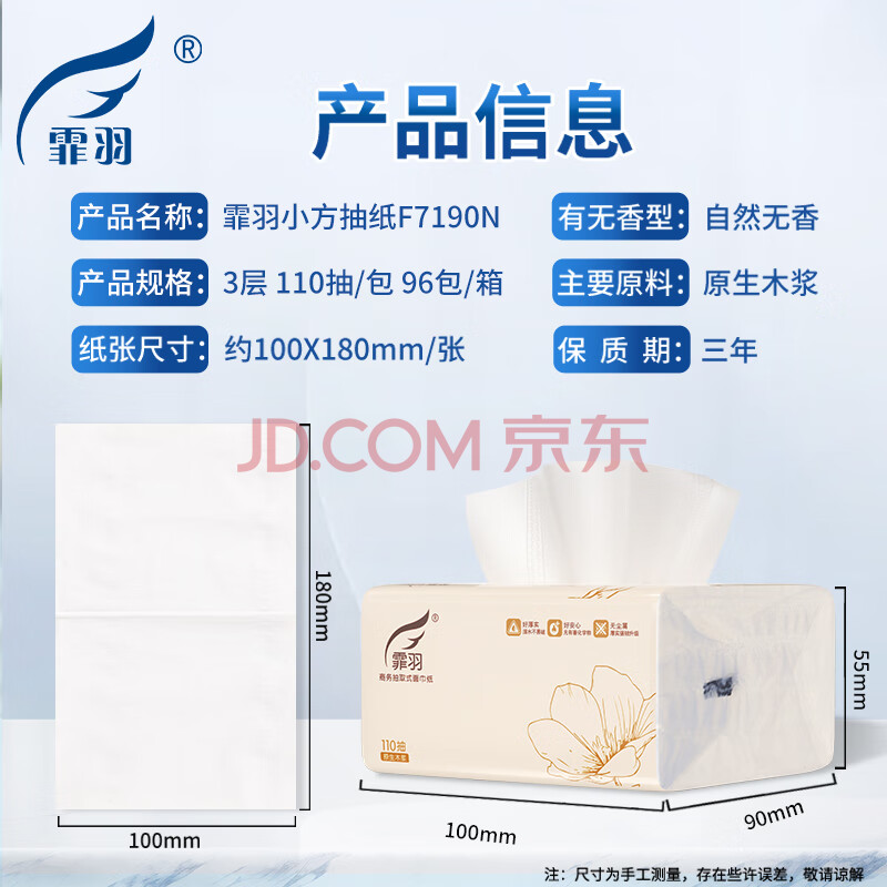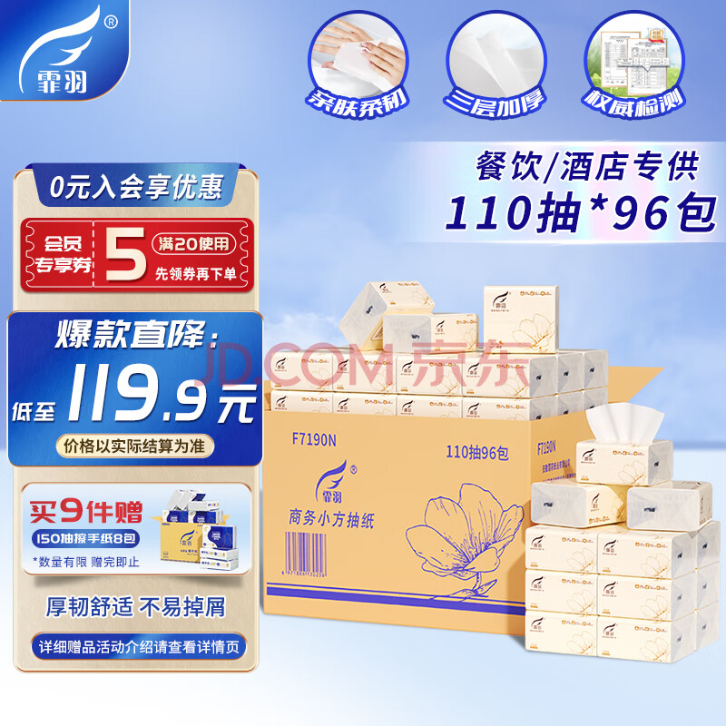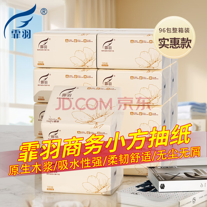 商品相册:霏羽小方抽纸3层110抽*96包方巾纸酒店饭店火锅简装纸巾餐巾纸F7190N第