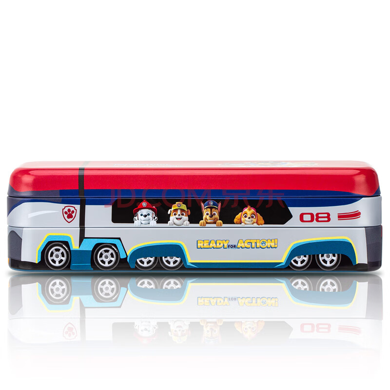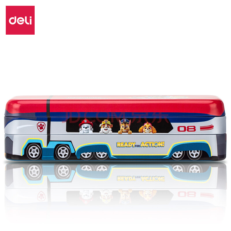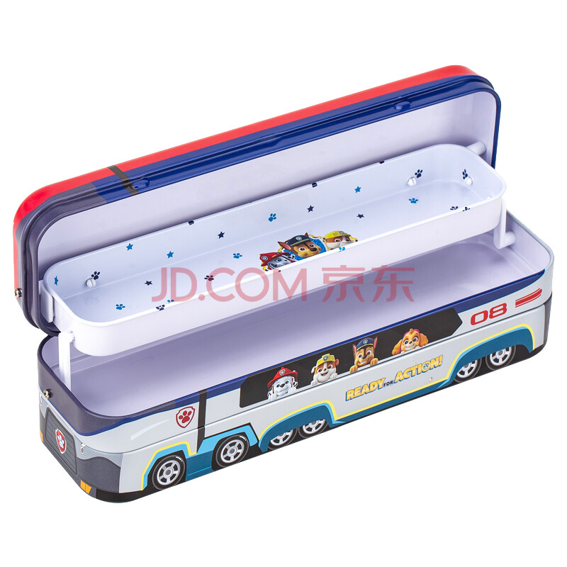商品相册:得力汪汪队救援大巴车文具盒马口铁三层可折叠铅笔盒 多功能收纳盒笔袋 红色开学必备第1张/共4