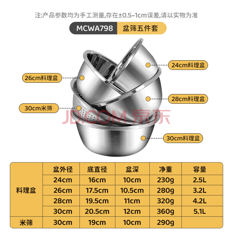 商品相册:美厨(maxcook)不锈钢盆筛五件套 30cm加大加厚洗菜盆和面盆调料盆套装 MCWA798第