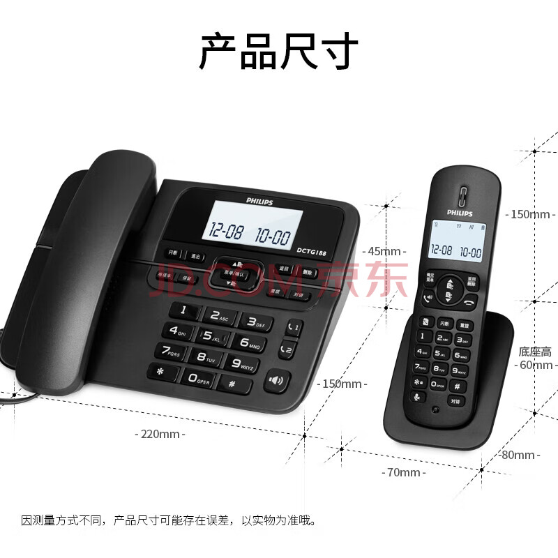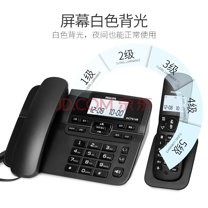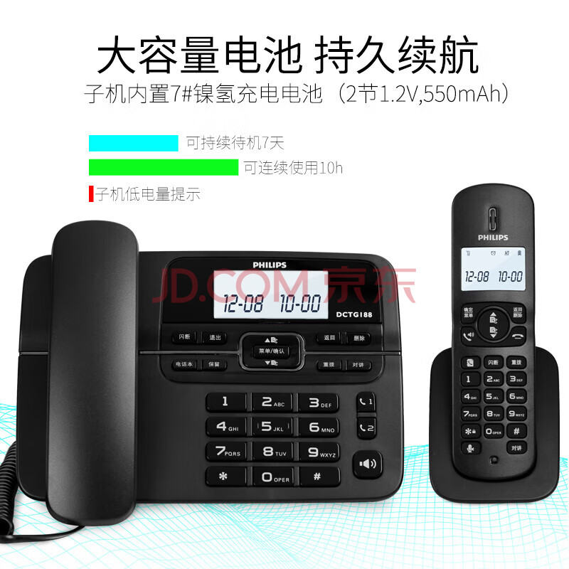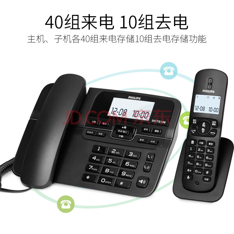商品相册:飞利浦(PHILIPS)PHILIPS 数字无绳电话机 无线固定座机电话子母机办公家用 一键拨号/电话本 DCTG188一拖一 黑色第