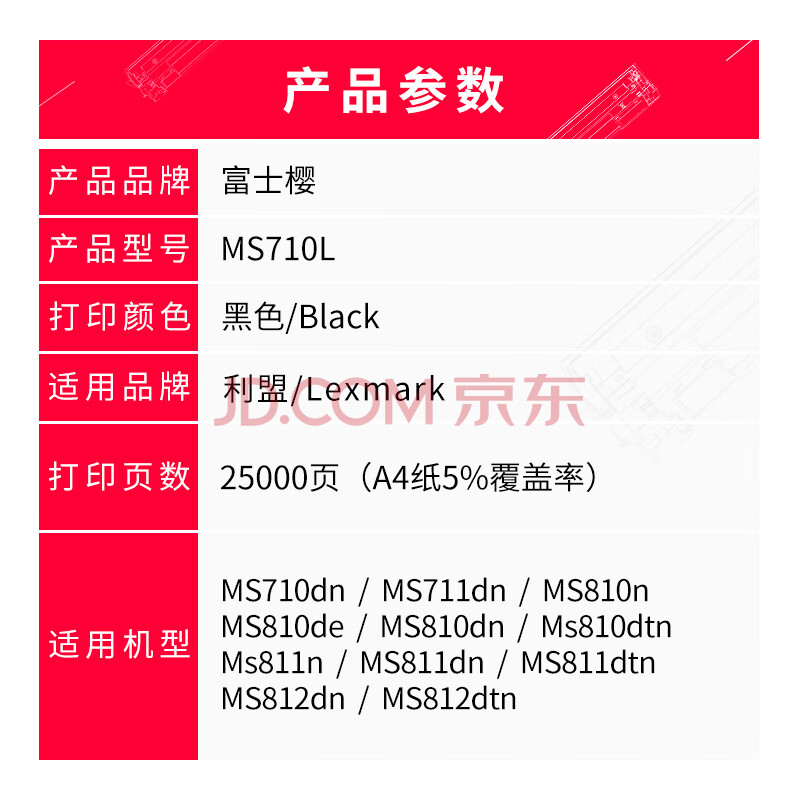 商品相册:富士樱MS710L高容量墨粉盒 适用利盟MS810n/de/dn MS811dn 52DOHON MS710dn MS711dn打印机墨粉盒25000页 黑色第