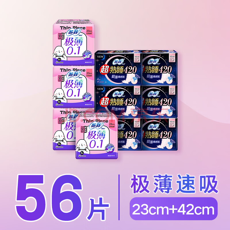 商品相册:苏菲超熟睡极薄0.1日夜卫生巾56片 瞬吸干爽无感姨妈巾自营官方旗舰第
