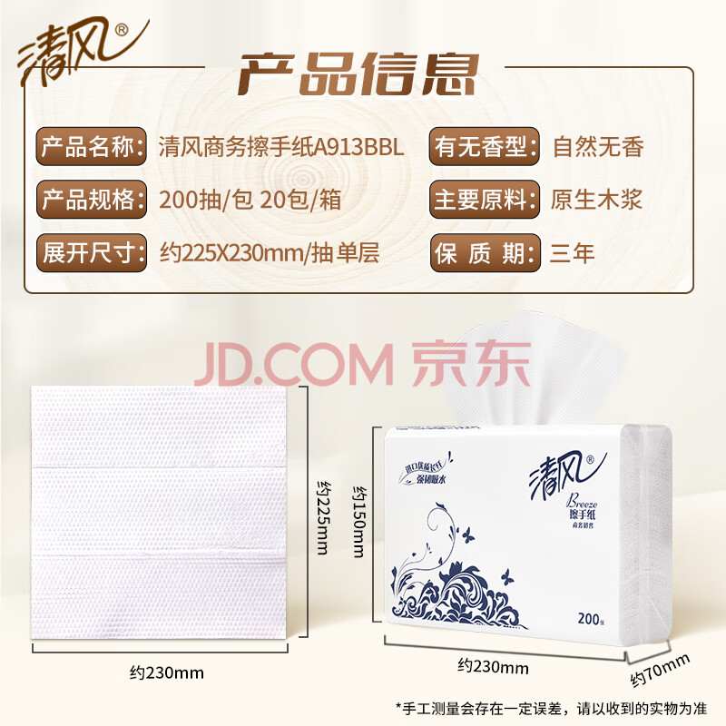 商品相册:清风擦手纸1层200抽*20包商用抽取式吸油纸酒店加厚洗手间干手A913BBL第