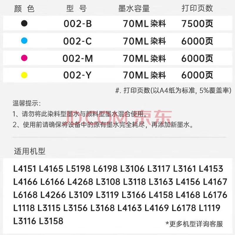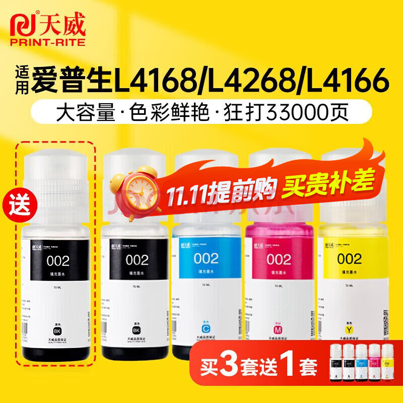 商品相册:天威002墨水四色适用爱普生打印机墨水L4266 L4268 L4168 L4269 4263 4158 6178 6176 6198 4169 6268 4166 第