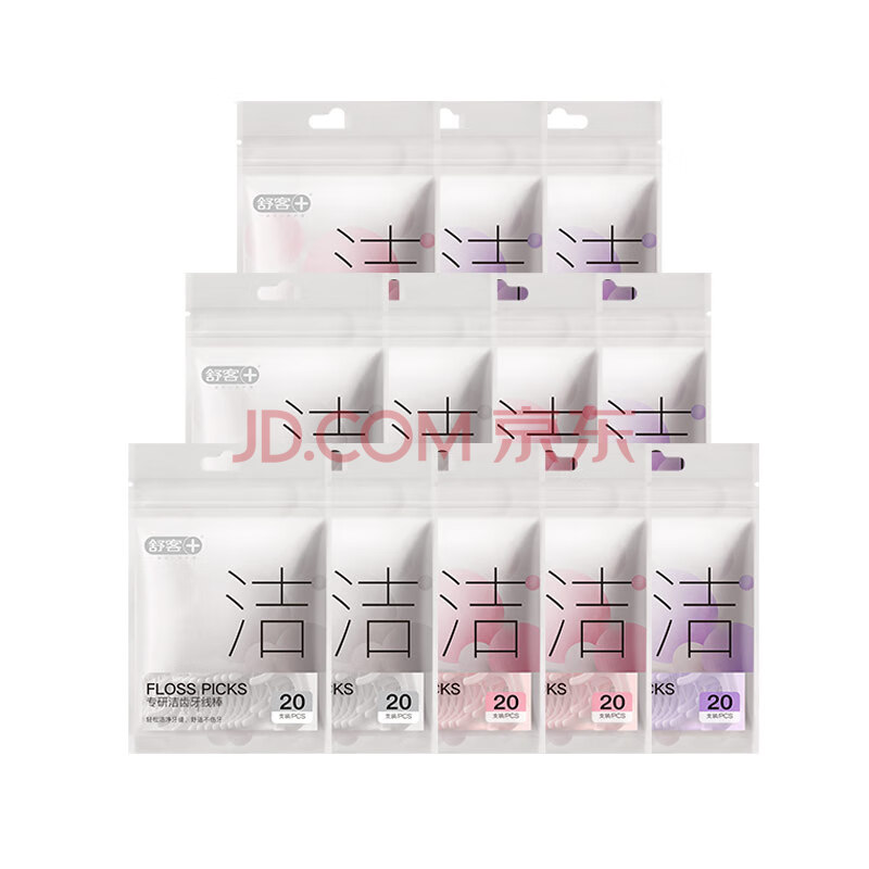 商品相册:舒客专研洁齿牙线棒 便捷牙签弹韧圆线清洁齿缝剔牙20支*12袋新旧随机第