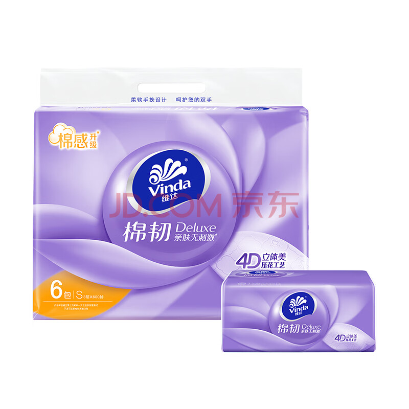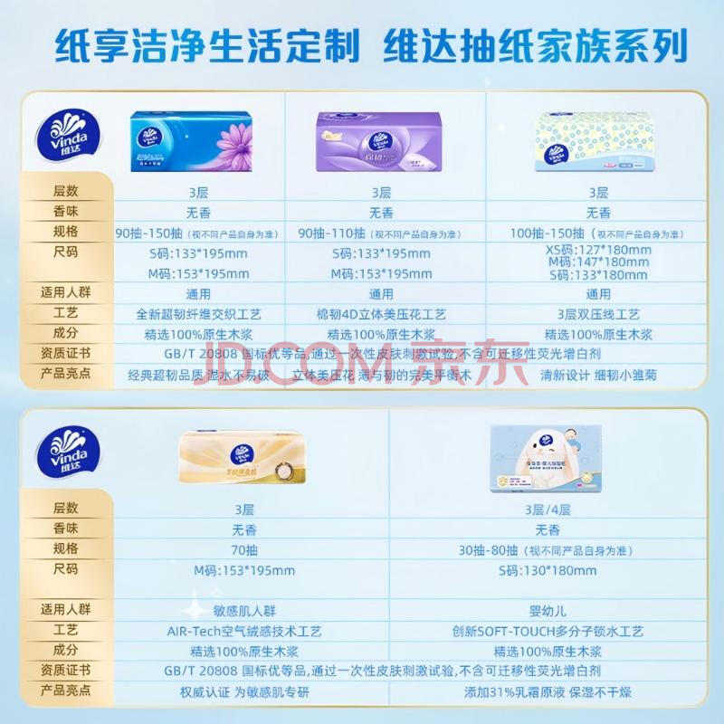 商品相册:维达(Vinda)抽纸 棉韧3层100抽*6包S码 亲肤无刺激 纸抽 卫生纸 餐巾纸 纸巾第