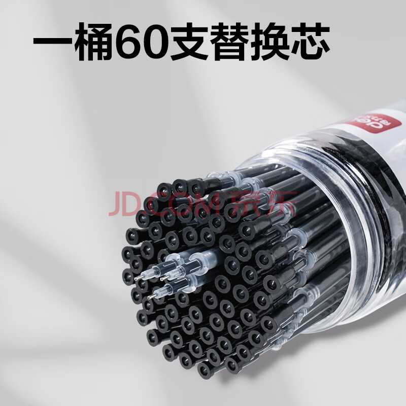 商品相册:得力(deli)0.5mm办公大包装拔帽中性笔替芯 学生全针管签字笔芯 黑色60支/桶 S211第