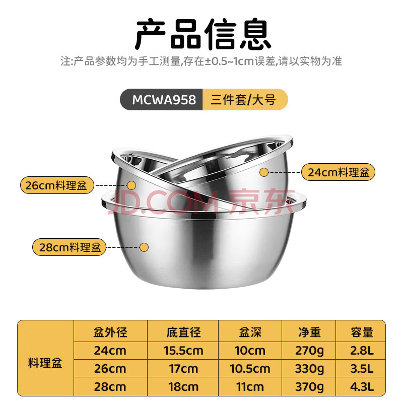 商品相册:美厨(MAXCOOK)304不锈钢洗菜盆 加大加厚调料盆洗菜盆套装 大号三件套MCWA958第