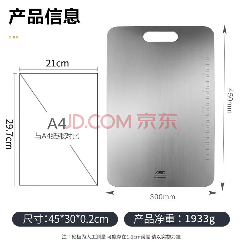 商品相册:爱仕达(ASD)菜板 304不锈钢抗菌防霉大砧板切菜板水果板饺子板GJ30C1WG大号第