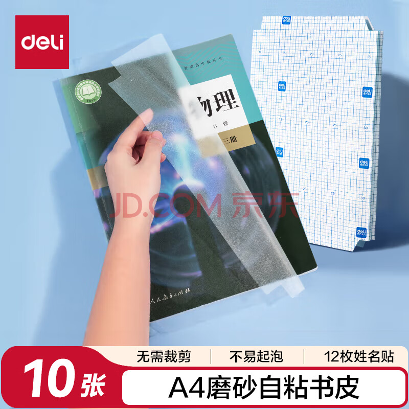 商品相册:得力(deli)10张A4自粘包书皮 透明包书膜小学生书套带切角 开学礼物开学文具第