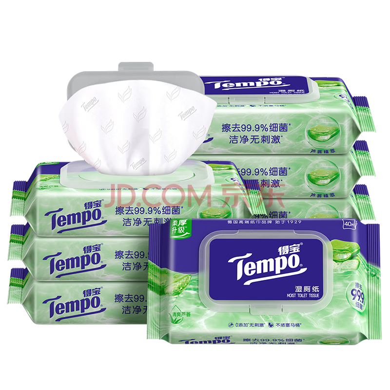 商品相册:得宝(TEMPO)一博同款 芦荟湿厕纸 40片*6包 植萃精华 可冲散 湿纸巾 湿巾 第