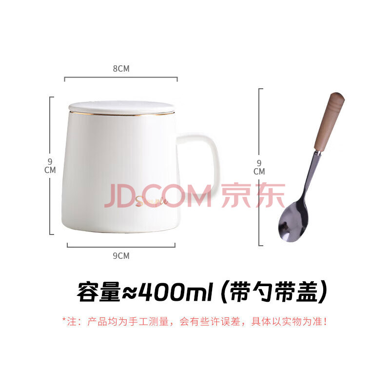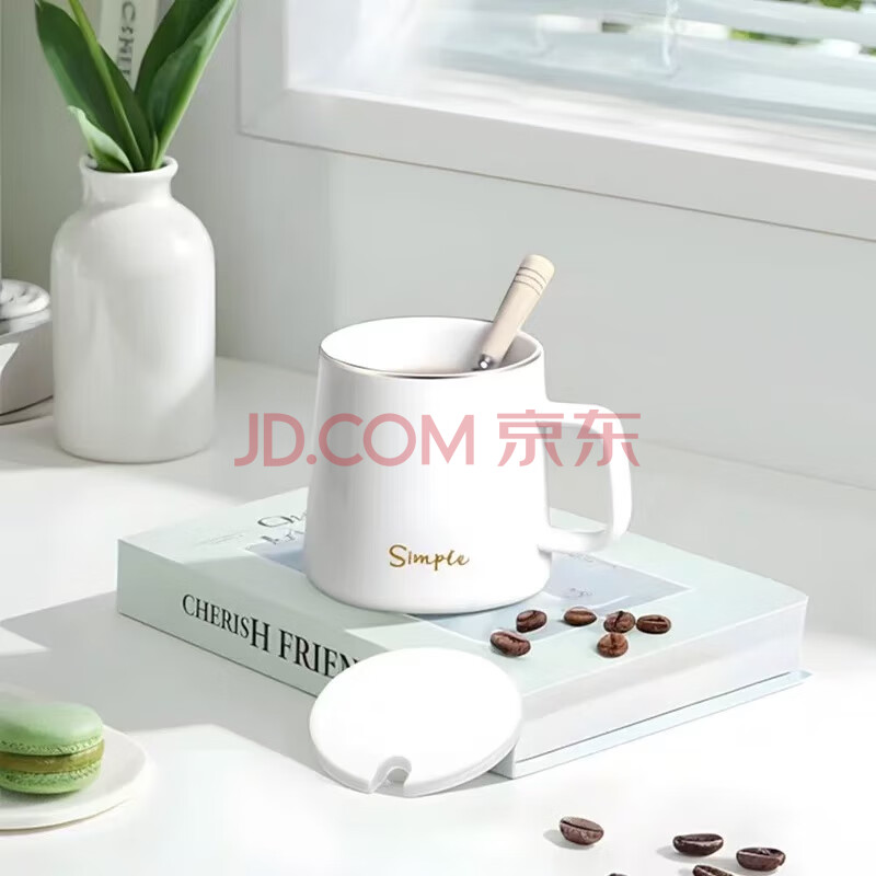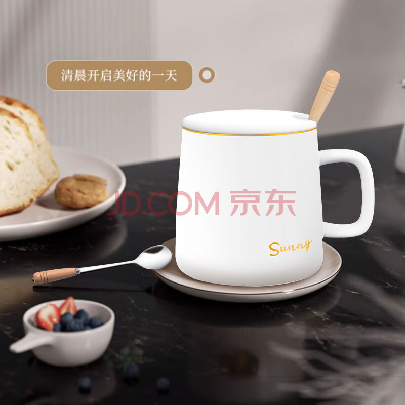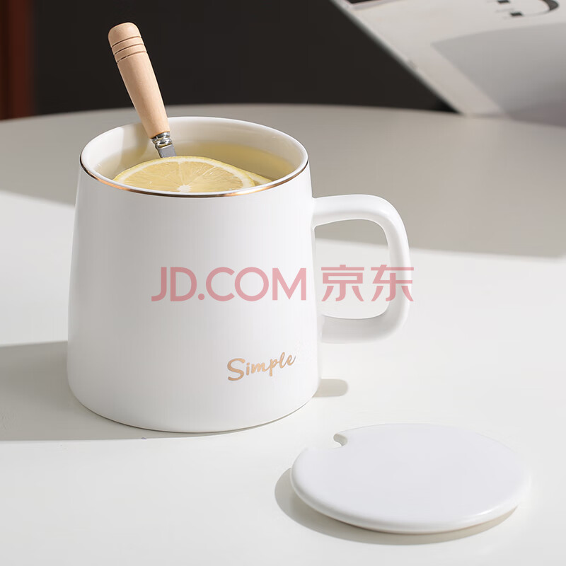 商品相册:传旗陶瓷马克杯带勺盖咖啡杯牛奶杯早餐杯办公杯男女茶杯描金白400ml第
