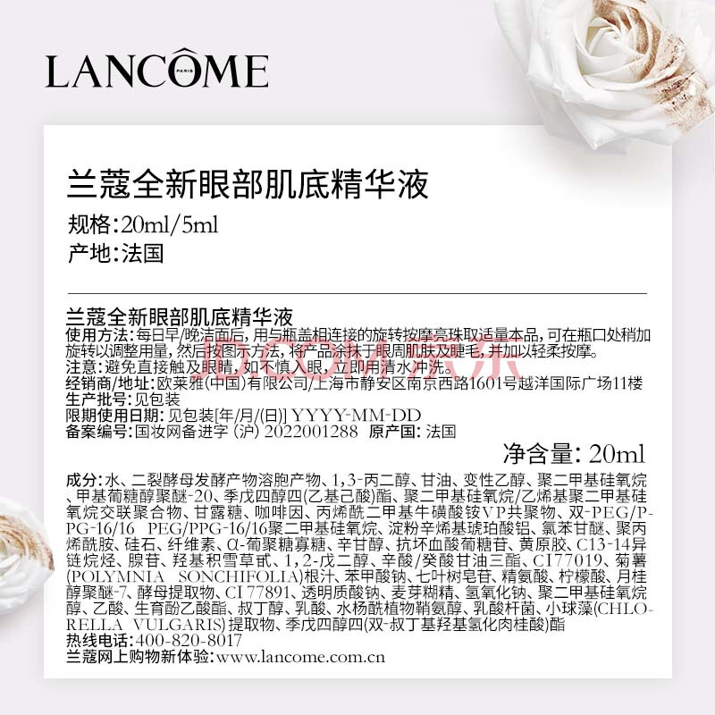 商品相册:兰蔻大眼精华20ml淡纹细纹紧致滋润眼周眼霜护肤品礼盒送女友生日礼物第
