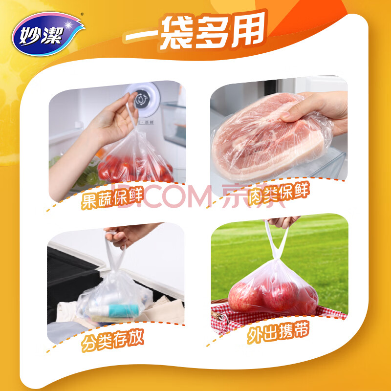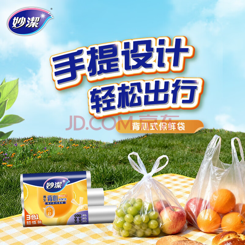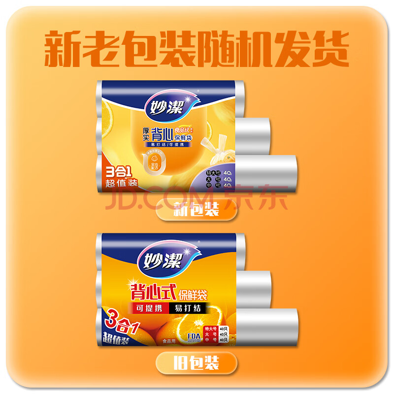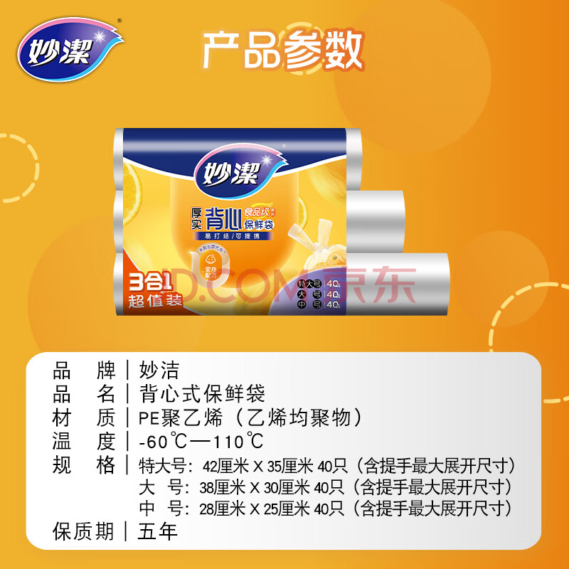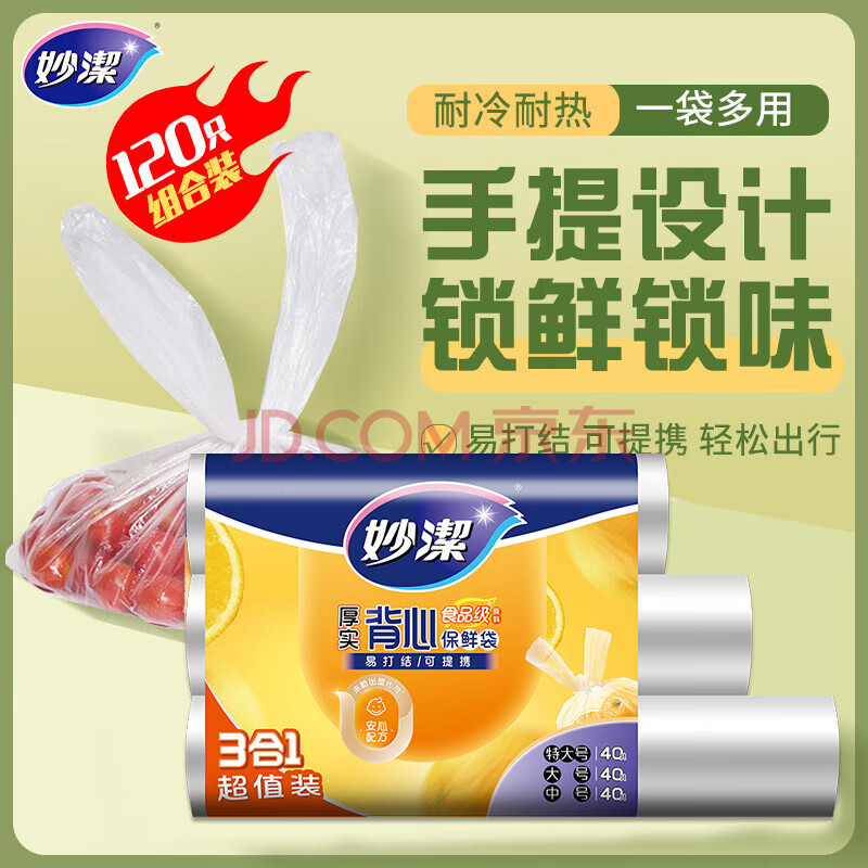 商品相册:妙洁手提背心式保鲜袋组合装中大特大号各40只共120只 背带型食品袋第