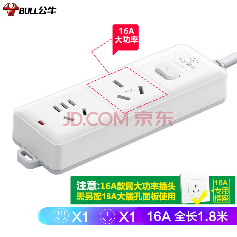 商品相册:公牛(BULL)大功率16A插座16a排插/插排/插线板接线板 适用空调热水器电暖气 2位总控全长1.8米送10A头S102D第