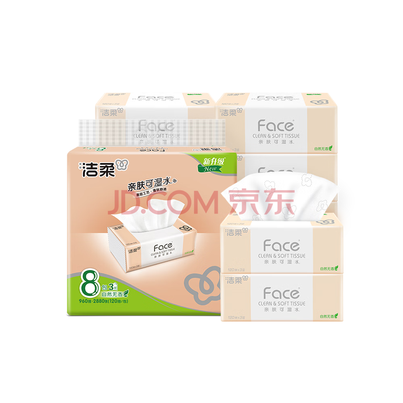 商品相册:洁柔抽纸 粉Face柔韧3层120抽*8包 可湿水面巾纸纸巾 湿水强韧第