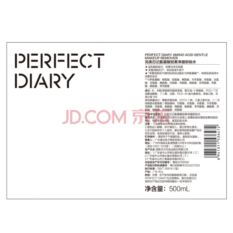 商品相册:完美日记氨基酸轻柔净澈卸妆水500ml清洁眼唇卸温和敏感肌可用第