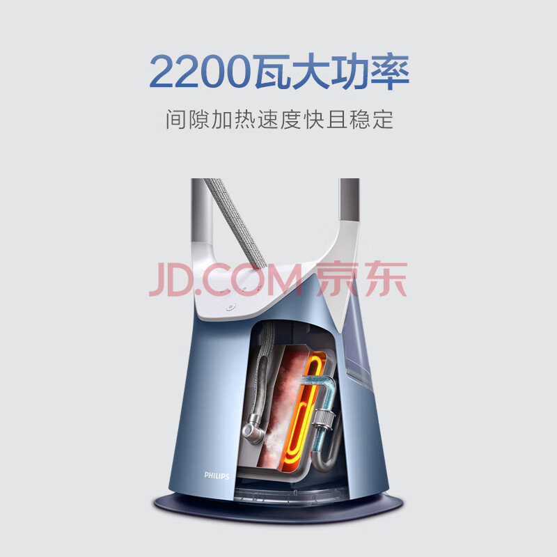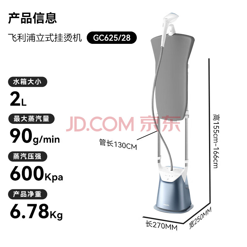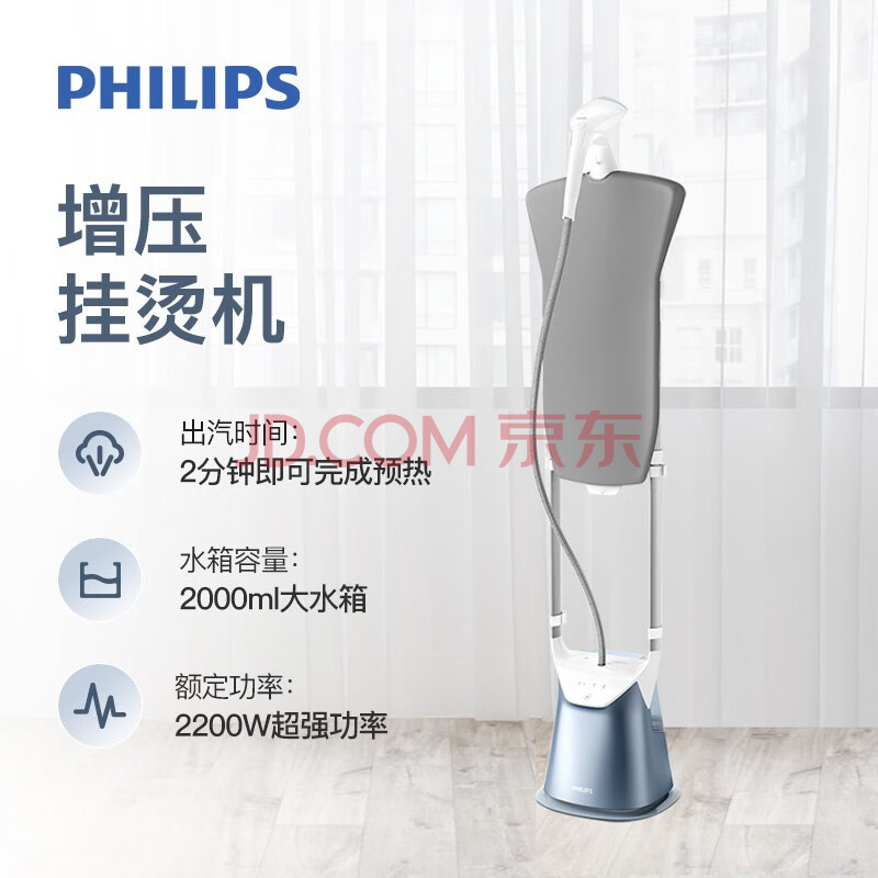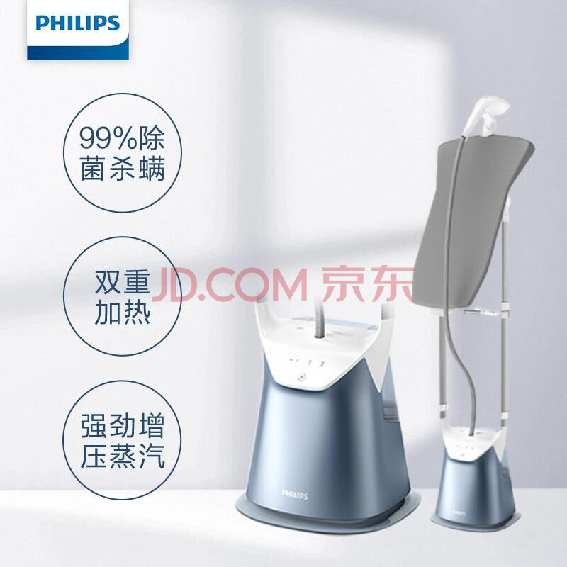 商品相册:飞利浦(PHILIPS)立式挂烫机增压蒸汽熨烫机家用多合一除菌除螨双杆带烫衣板 GC625/28第1张/共8