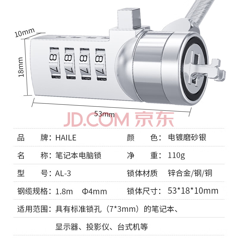 商品相册:HAILE笔记本电脑锁 防盗安全密码锁标准锁孔适用联想华硕神舟微星宏碁机械革命7*3通用锁 AL-3第