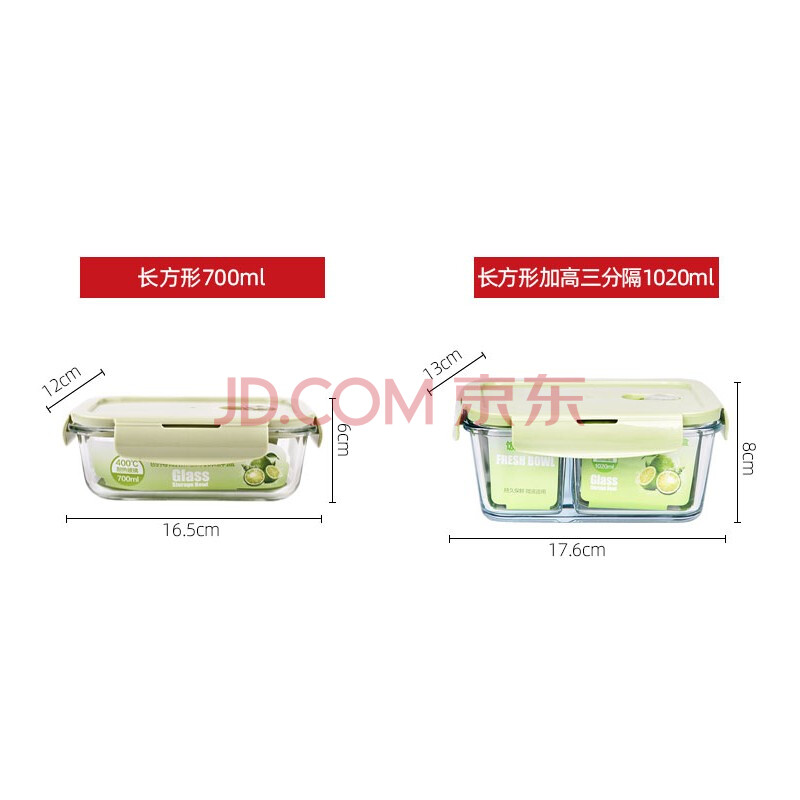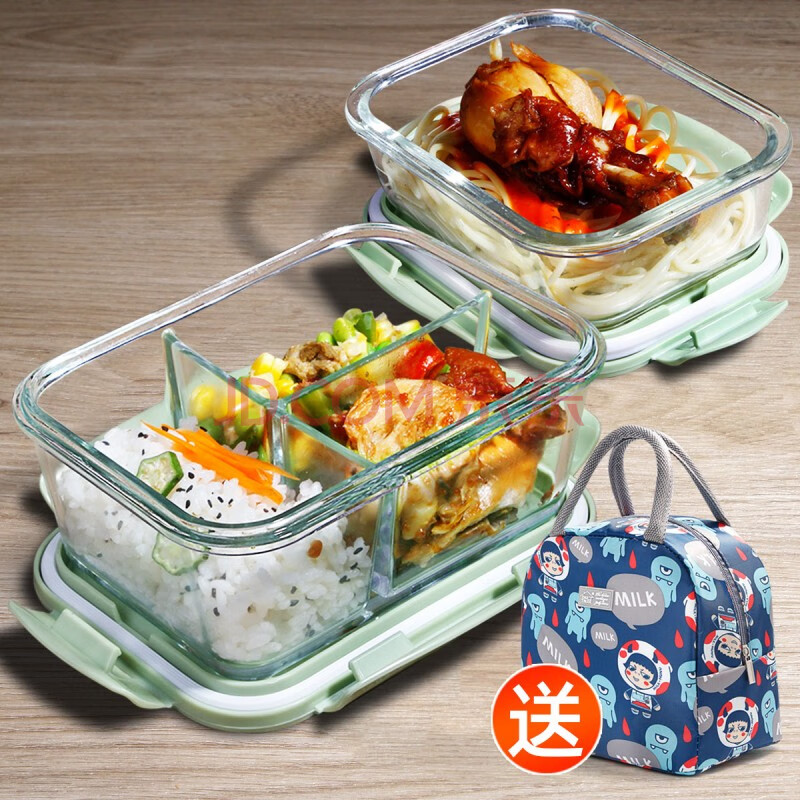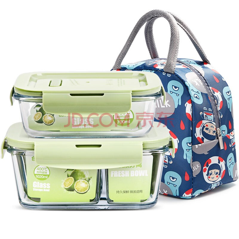 商品相册:创得 耐热玻璃保鲜盒 微波炉饭盒上班族便当盒 加高三隔1020+700ml+包第