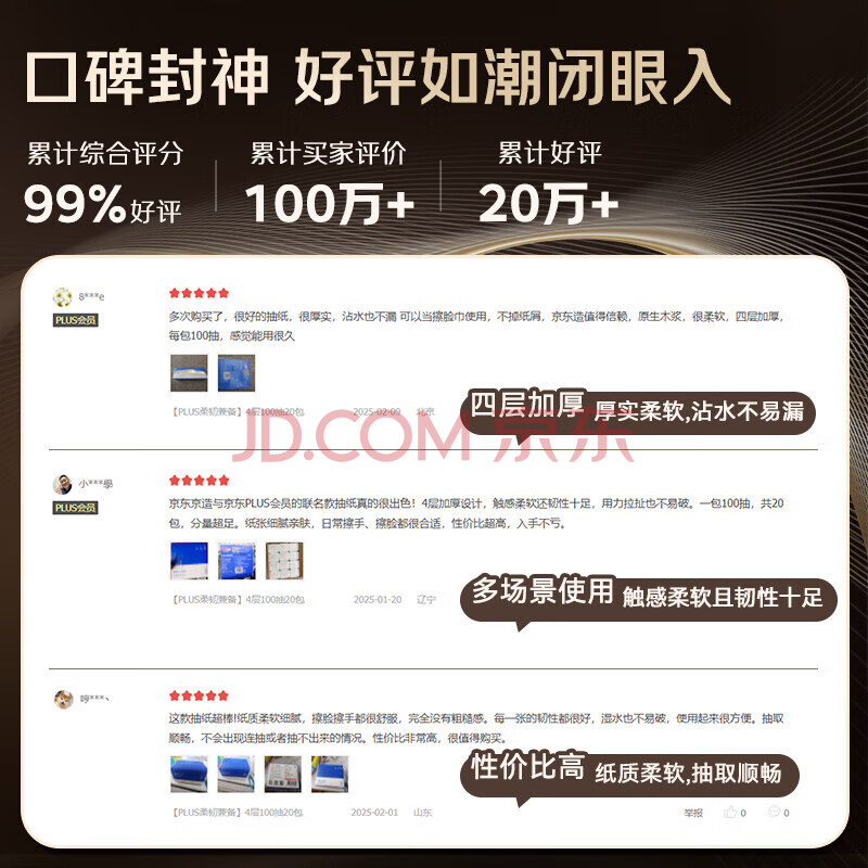 商品相册:京东京造X京东PLUS会员联名款纸巾 4层加厚100抽*20包卫生纸抽纸京东自营第
