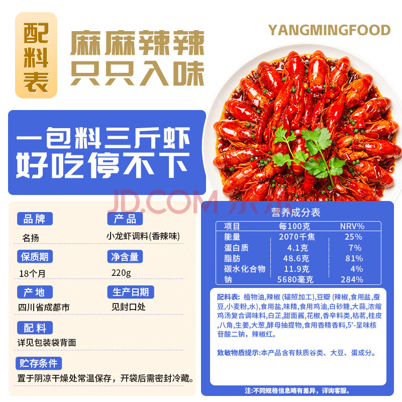 商品相册:名揚名扬麻辣小龙虾调味料220g*1袋 麻辣味虾蟹调味料包啤酒虾调味品第