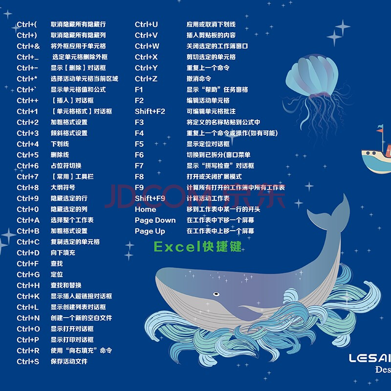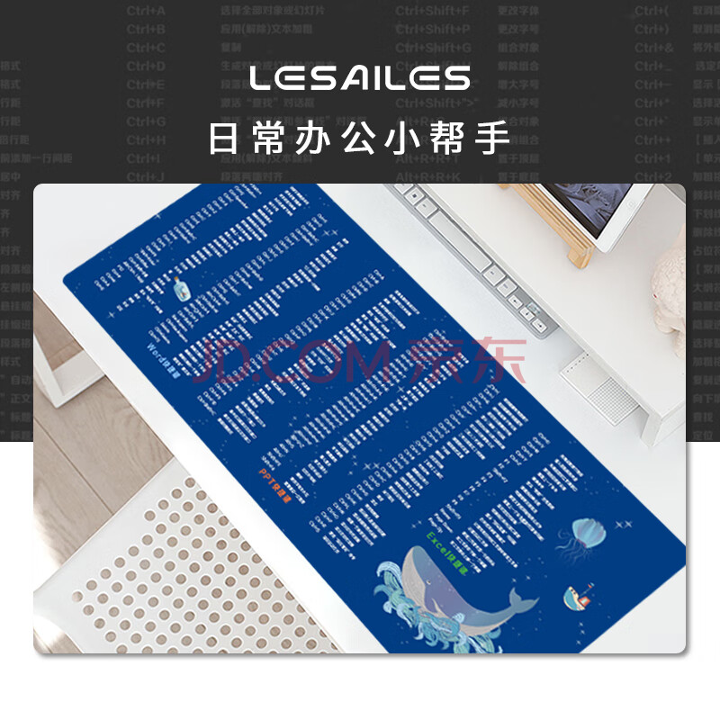 商品相册:飞遁LESAILES海洋鲸鱼快捷键大全蓝色大号鼠标垫 锁边加厚办公电脑桌垫800*300*3mm第