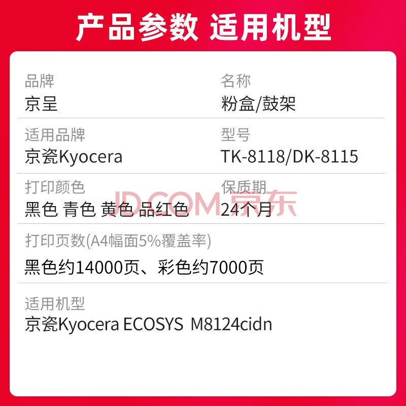 商品相册:京呈TK-8118粉盒适用京瓷(kyocera)Ecosys M8124cidn复印机粉盒打印机硒鼓墨盒TK8118碳粉盒 四色套装第