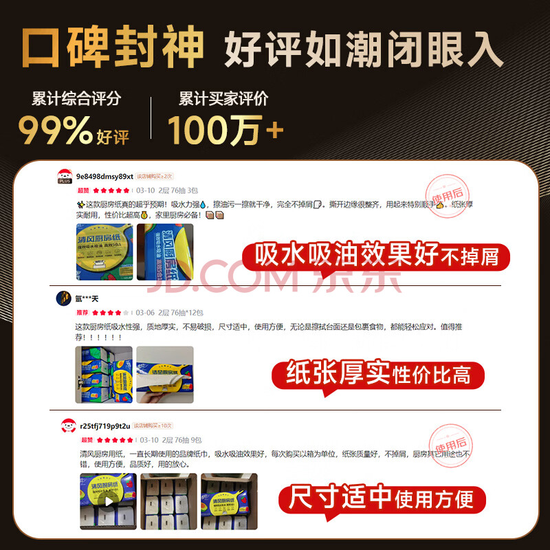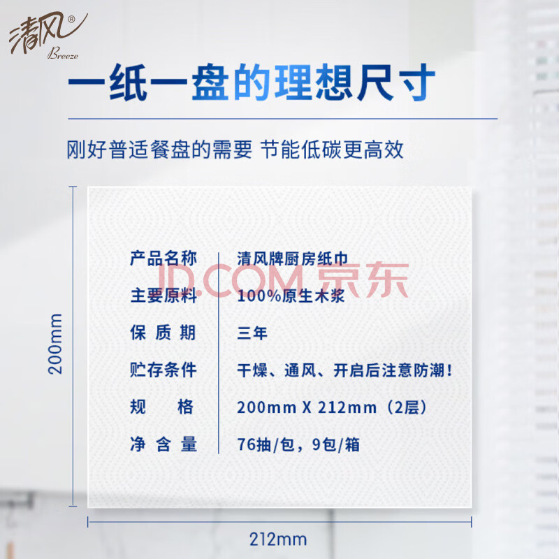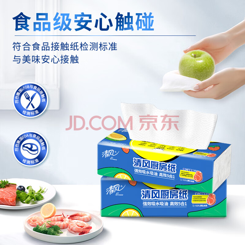 商品相册:清风厨房抽纸76抽*9包一次性吸油纸 食品接触级 吸油吸水厨房纸巾整箱第