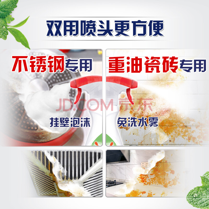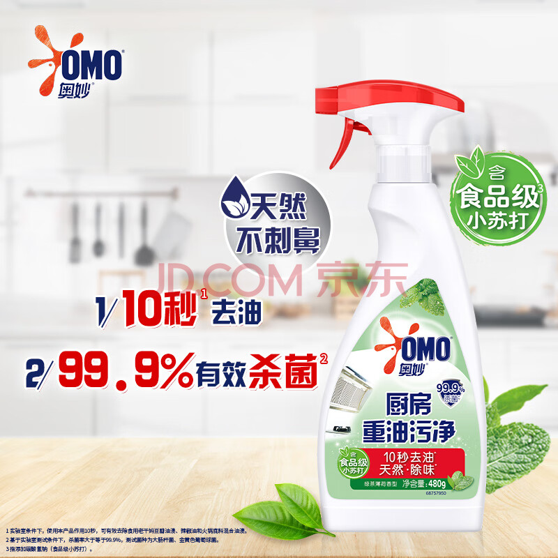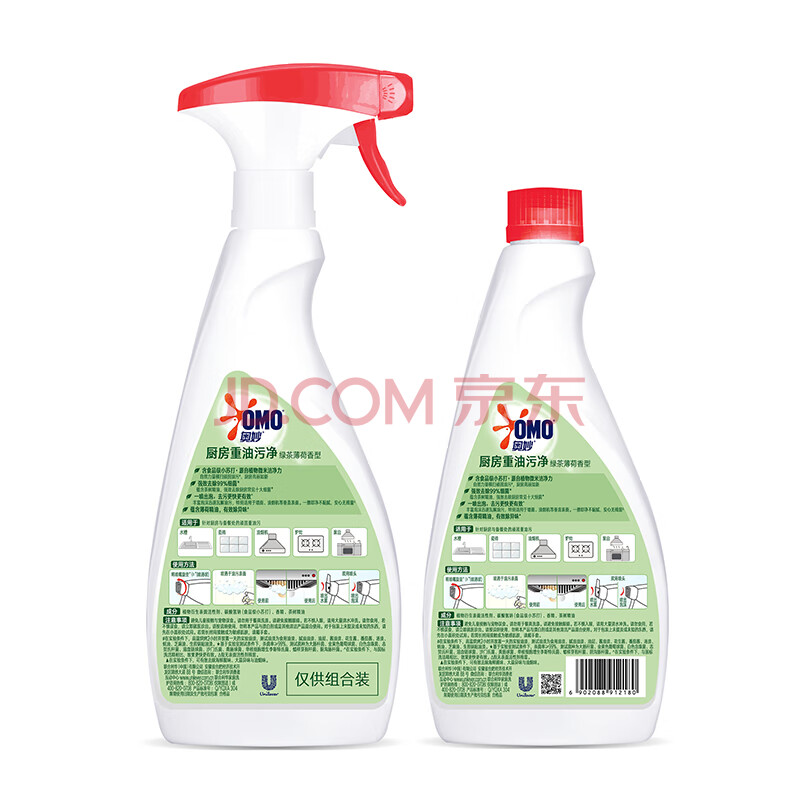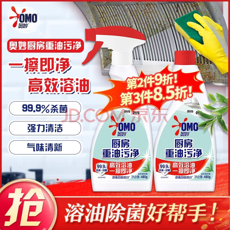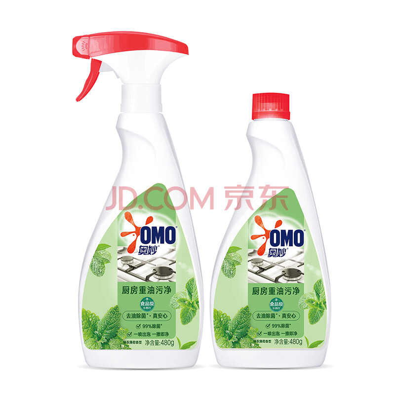 商品相册:奥妙重油污净含替换装 480g×2绿茶薄荷香型双瓶装厨房去油污清洁剂第