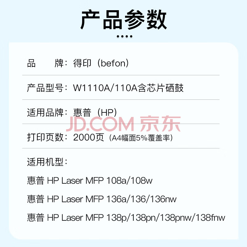 商品相册:得印适用惠普136w硒鼓 W1110A 110A硒鼓易加粉 适用惠普136a 136wm 136nw 108w/a 138p 138pn 138pnw粉盒带芯片第
