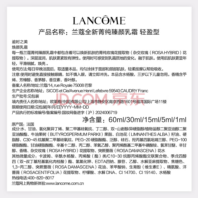 商品相册:兰蔻菁纯面霜30ml 轻盈版玻色因抗皱滋润护肤品礼盒送女友生日礼物第