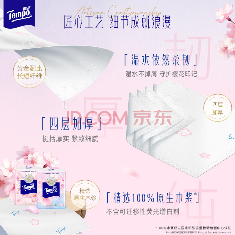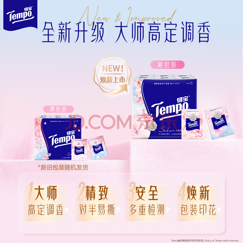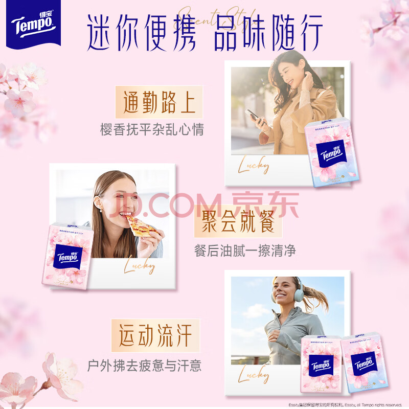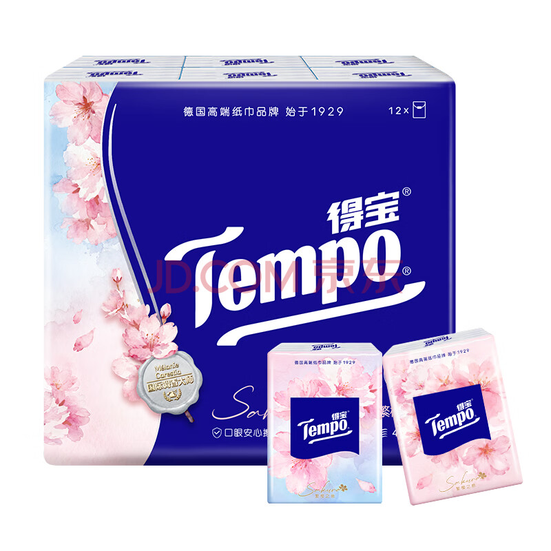 商品相册:得宝(TEMPO)一博同款 手帕纸 樱花味4层7张*12包 湿水不破 纸巾小包 面巾纸第