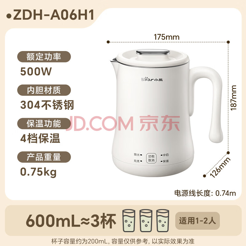 商品相册:小熊(Bear)便携式烧水壶烧水杯304不锈钢电热水壶 0.6L迷你恒温水壶养生家用旅行冲奶电水壶 ZDH-A06H1第