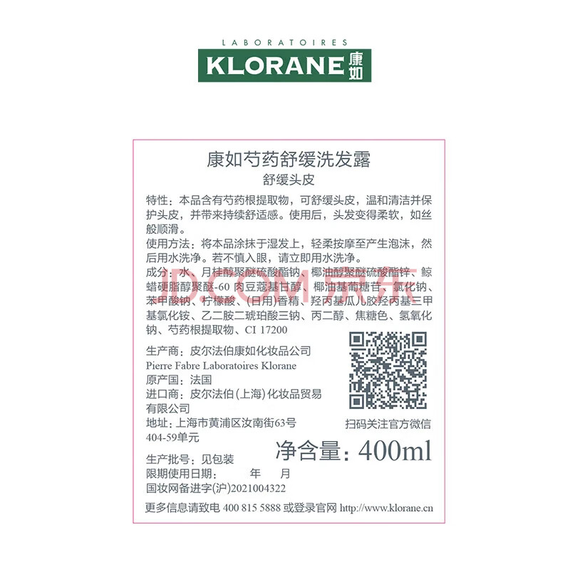 商品相册:康如(KLORANE)【樊振东专属】芍药舒缓洗发露400ml*2 舒缓头皮蓬松维稳洗发水第