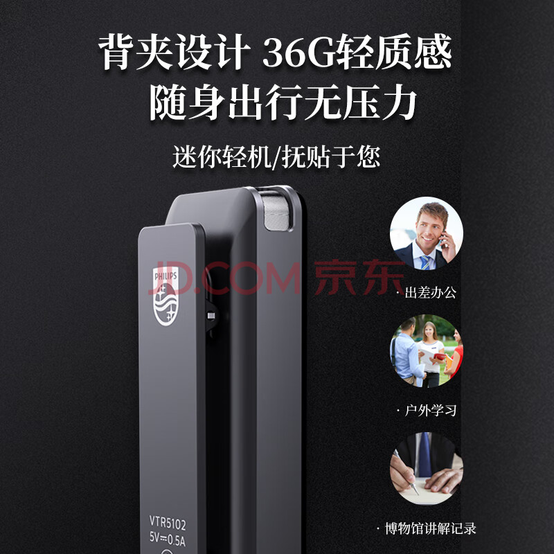 商品相册:飞利浦智能便携录音笔VTR5102 16G免费APP语音转文字 高清降噪 学习会议高灵敏录音器第
